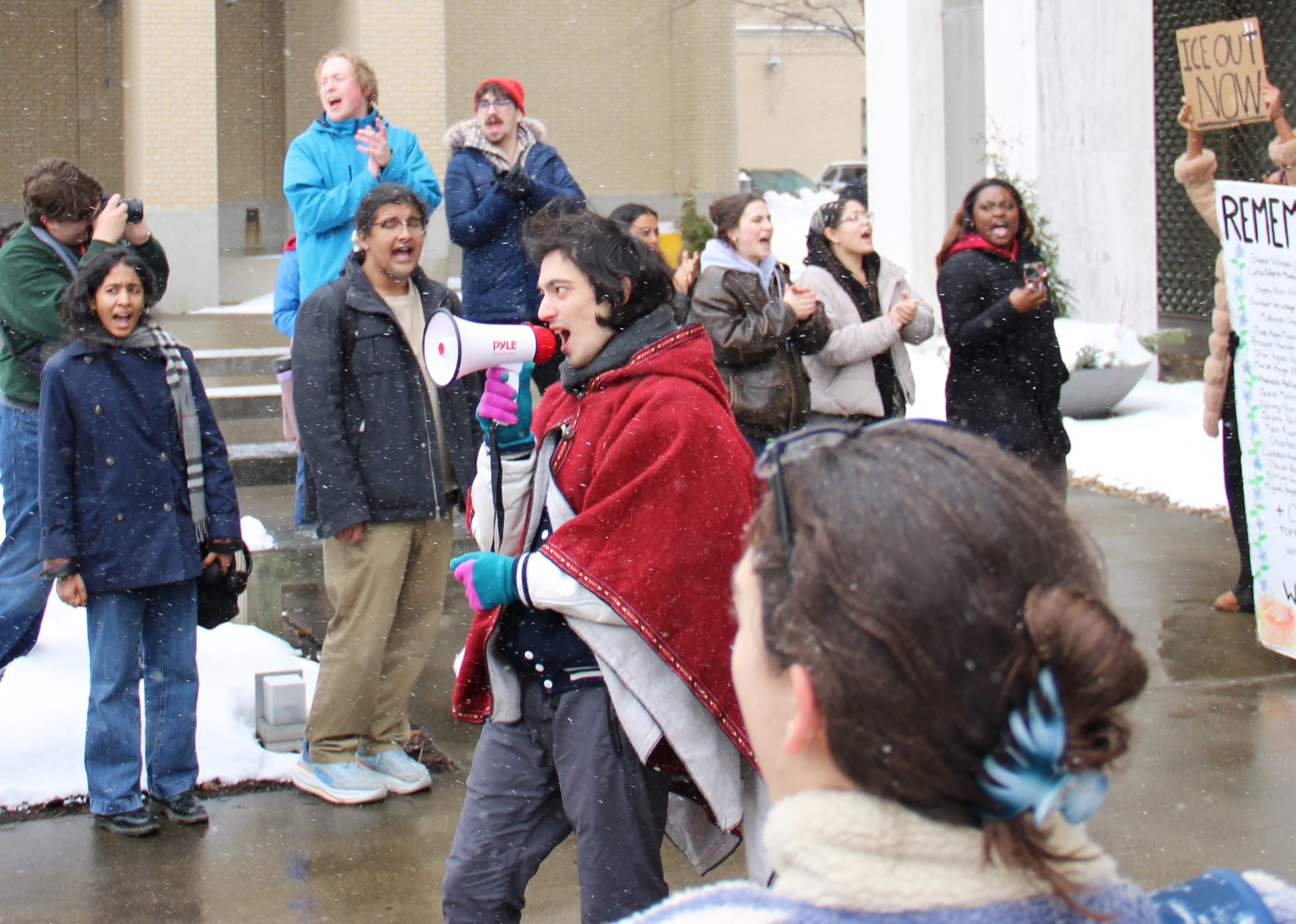 Afterwards, the protestors marched to Warner Hall, the main administration building. There, Savi Bhat, president of the College Democrats called on campus leaders to “reaffirm their commitment to international students, provide training for faculty and staff on what to do if ICE shows up on campus, and publicly condemn ICE for their actions in Minneapolis and Los Angeles and all across the country.”