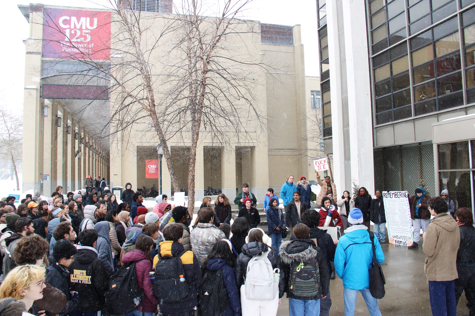 “There has been an ICE sighting in Squirrel Hill recently,” Khan informed the crowd, referring to a neighborhood that borders Carnegie Mellon. “They were at Alderdice High School (and) expected to lurk and try to round people up after school let out.”