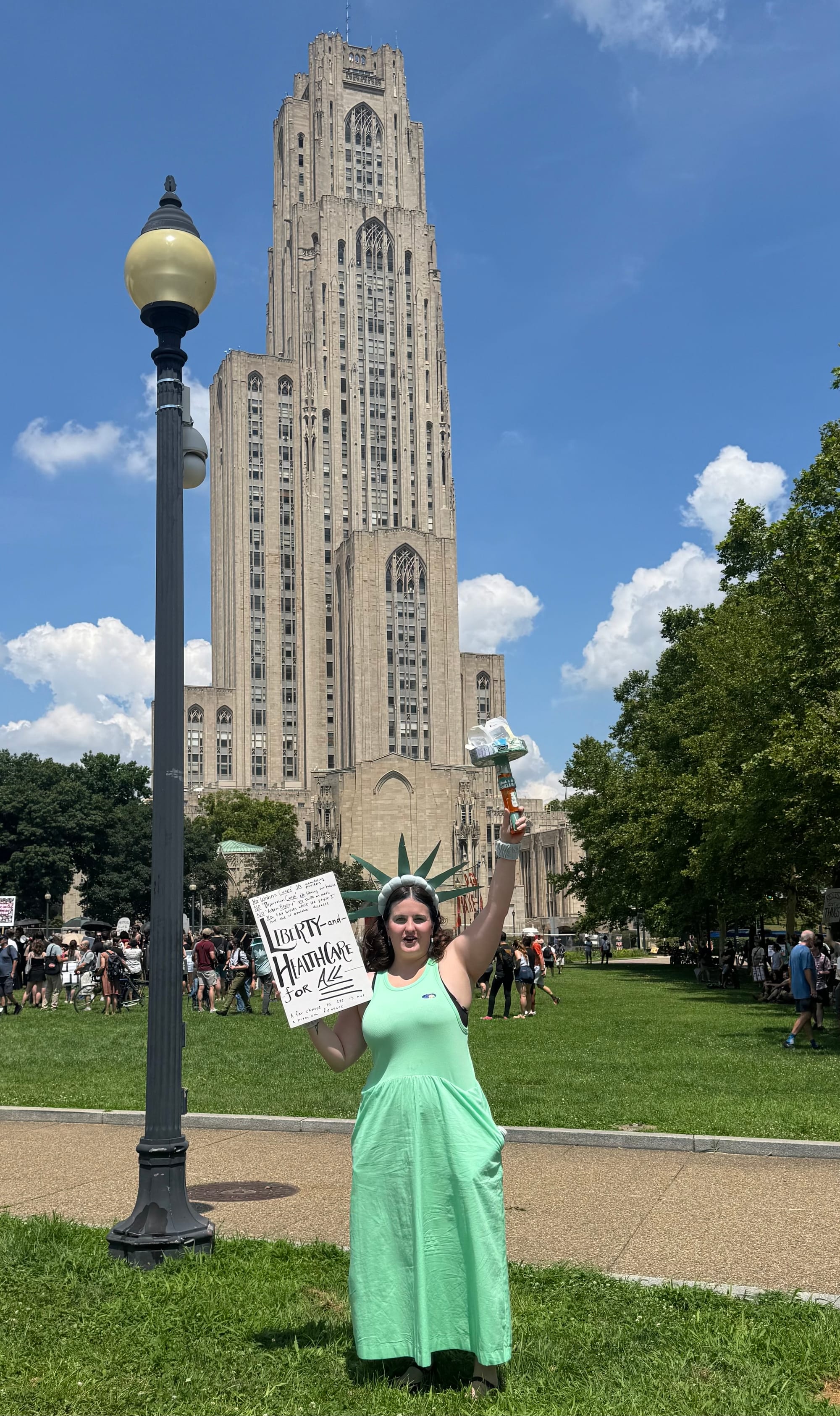 A half-mile away in the "free speech zone" at Schenley Plaza, Katie Dickey, a 25-year-old social worker who struggles with a rare form of immunodeficiency, is dressed up as a "Statue of Liberty." She's smiling festively, but her reason for being there is quite grim.
