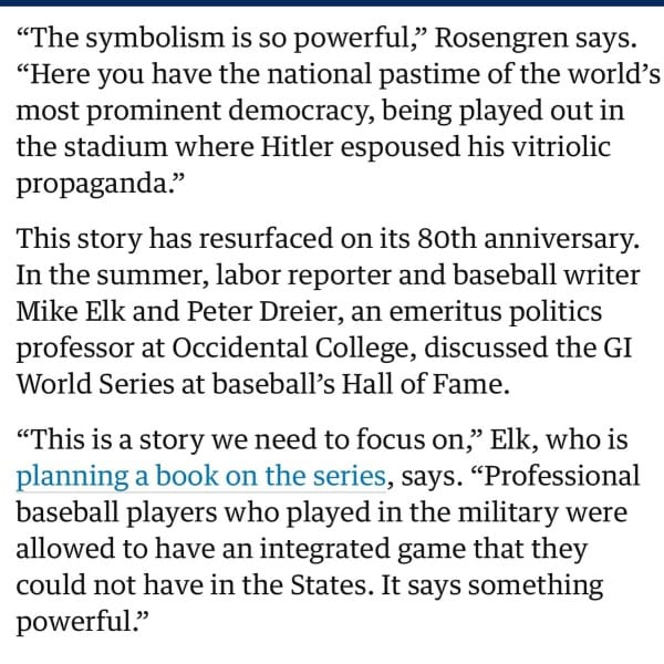 If you haven't, set aside a half hour (lol!!) and read my 8,000-word research paper presented at the Baseball Hall of Fame entitled "The 1945 GI World Series in Hitler’s Nuremberg Stadium: Baseball’s ‘Double Victory’ Against Segregation at Home and Abroad"
