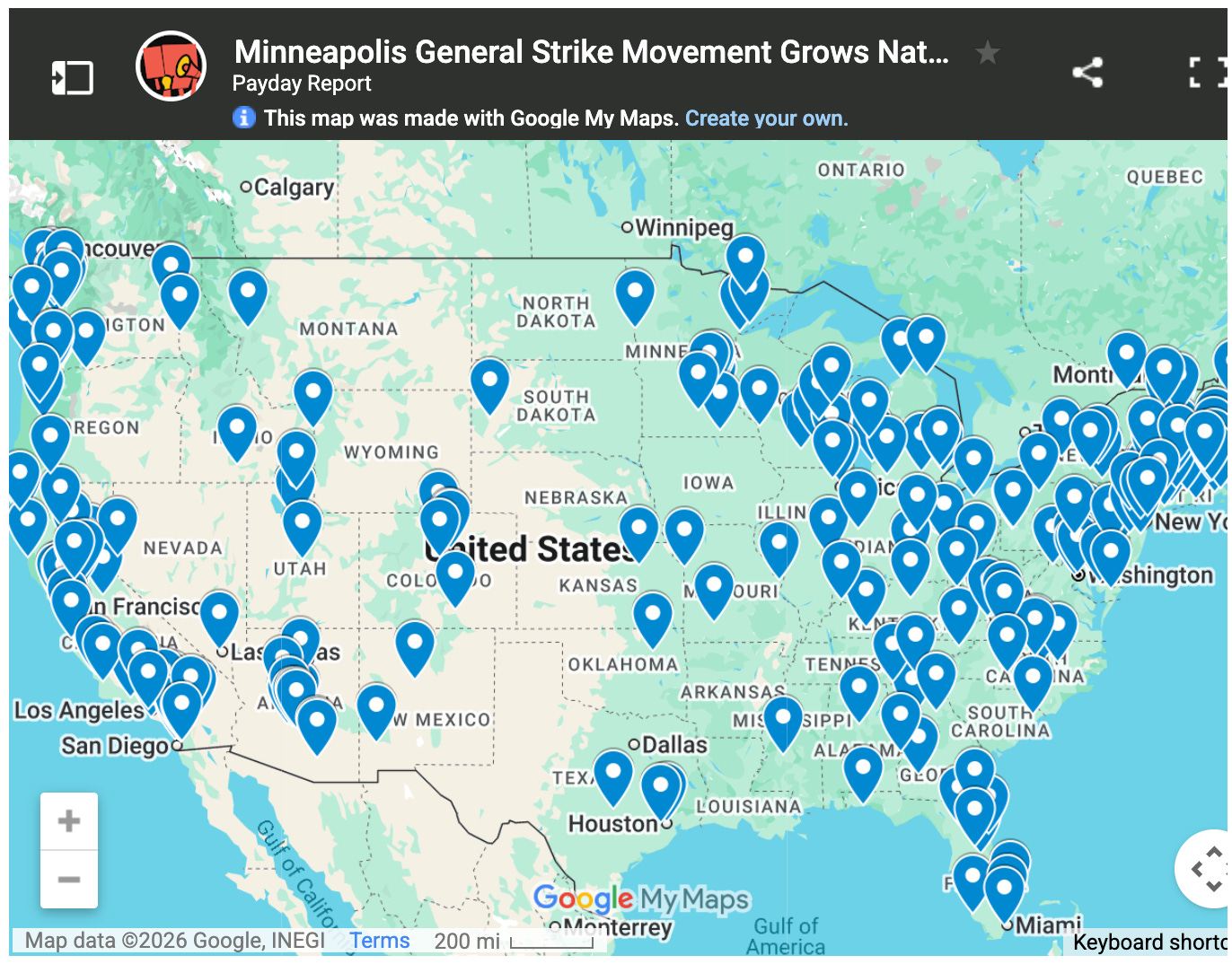 Payday Report’s strike tracker, updated throughout the week, now shows solidarity actions planned in two hundred and fifteen cities across all fifty states. The number was forty-three on Sunday. It was a hundred and twenty on Tuesday.
